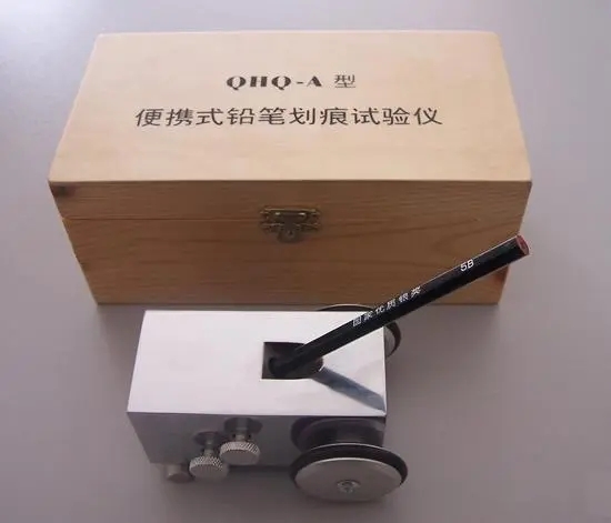 4、判別硬度,看試片有無刮痕。建議試片最少做三個(gè)位置以上,取平均值。硬度級(jí)數(shù)從軟到硬分別為:6B.5B.4B.3B.2B.B.HB.F.H.2H.3H.4H.5H.6H.7H.8H.9H,共17種。例如:使用H鉛筆表面無刮痕,使用2H鉛筆表面也無刮痕,使用3H鉛筆表面有刮痕,所以試驗(yàn)片涂裝硬度級(jí)數(shù)為:2H。